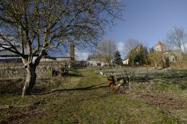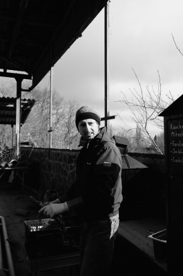 Während wir so stehen und den Fisch im Ofen betreuen kommen immer wieder Neugierige vorbei, die auch mal einen Blick auf den Räucherfisch werfen wollen. Teils sind das Nachbarn, teils Besucher von Nachbarn, die geschickt wurden »um dem Fischmann über die Schulter zu gucken«. Mit allen kommt man nett ins Gespräch, Micha erzählt von seiner Arbeit und von seinem Fisch. Und von seinem großen Vorhaben: Ab Sommer sollen sich hier auf dem Gelände der ehemaligen Schlossgärtnerei wochenends Gäste tummeln, Räucherfisch kaufen, sich mit einem kleinen gastronomischen Angebot vergnügen und eine gute Zeit haben. Bei unserem Besuch sieht alles noch gut nach Baustelle aus, aber wir erahnen, dass dieser Ort einmal bezaubernd wird. Denn als wir ein paar Schritte gehen, liegt vor uns ein großer terrassierter Garten. Trotz matschigem Boden und Winterstimmung nimmt uns das Licht, in das der Südhang getaucht ist, sofort gefangen. Die Sonne wärmt die Gartenbeete, und man hat sofort vor Augen wie schön es hier im Sommer sein muss. »Die Schlossgärtnerei gibt es ungefähr seit 150–200 Jahren,« weiß Micha über das Gelände zu berichten. Zweieinhalb Jahre werkelt er hier nun schon, hat regelmäßig helfende Freunde und Bekannte aus der Stadt zu Arbeitseinsätzen motivieren können und bezieht auch die Gerswalder mit ein.
