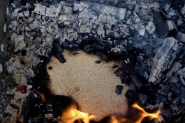 Es qualmt aus den Schornsteinen zweier schwarzer Räucheröfen. Mit der flachen Hand kontrolliert Michael Wickert auf der schrägen Dachfläche der Öfen die Temperatur. Je nachdem wie warm es dort wird, muss er für mehr oder weniger Luftzufuhr sorgen. »Ich teste hier oben die Temperatur. Immer mal wieder mach ich das hier auf, lasse es wieder mehr brennen, dann mach ich wieder zu.« Der Wahlberliner, der eigentlich vom Bodensee kommt, schiebt sich seine dunkle Wollmütze aus der Stirn, geht in die Hocke und dreht den Schieberegler am unteren Ende beider Öfen. »Die Glut ist jetzt abgebrannt, da gebe ich jetzt zweierlei Holz drauf: Das hier ist Wacholderholz und das hier ist Buche«. Er zieht die Tür auf und wirft ein paar Scheite hinein. Das Wacholderholz hat wie die Beere ätherische Öle. Das gibt ein schönes Aroma, heißt es. Unten beginnt die Glut zu lodern. »Oben machen wir mal kurz auf, aber das soll nicht brennen. Ich räuchere bei relativ niedriger Temperatur. Der Fisch soll nicht zu heiß werden. 85 bis 90°C sind gut, man sollte aber auch mal auf 100°C kommen«, verrät er.