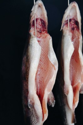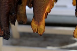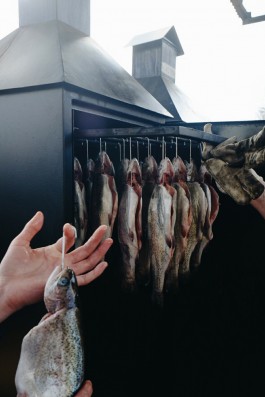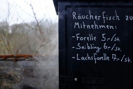 Den Fisch, es sind gut zwei Dutzend Lachsforellen, haben wir zuvor gemeinsam auf Haken gesteckt: Einmal durch das Maul fädeln, dann den Haken drehen und links und rechts der Wirbelsäule zwei kleine Dorne ins Fleisch stechen. Und unbedingt die ganze Zeit mit dem Daumen festhalten, sonst flutscht der Fisch wieder runter vom Haken. Ziemlich glitschig und irgendwie sperrig, so ein Fischkörper. »Das sind Teichfische, die sind gezüchtet, kommen aus Angermünde oder Boitzenburg,« erklärt der Fischmann die Herkunft seiner Rohware. »Die Region soll profitieren. Ich kaufe den Fischern der Umgebung den Fisch zu ’nem guten Preis ab und veredele ihn dann.«