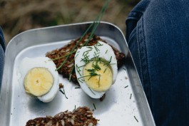 Von Neudorf aus laufen wir in nordwestlicher Richtung zum Stiernsee. Das heißt, eigentlich führt unser Weg nur daran vorbei. Aber es lockt eine hübsche kleine Badestelle, die wir uns genauer ansehen. Zwar haben wir bei diesem grauen, kühlen Wetter keinerlei Badelust — immerhin blühen gerade die Schneeglöckchen — wir wollen uns diesen Ort aber unbedingt für den Sommer merken. Weiter geht es im Rechtsbogen durch den Wald. Eigentlich erwarten wir zu dieser Jahreszeit keine botanischen Wunder, wir sind froh, dass die knospenden Zweige der Büsche und Bäume so langsam den Winter beenden. Doch bei dem, was da aussieht wie ganz normales Gras, müssen wir zweimal hingucken. Ist das wirklich Schnittlauch? Ja, der Geruch bestätigt unsere Vermutung, wir können bei unserem Picknick Ei mit wildem Schnittlauch genießen. (Natürlich warnen wir an dieser Stelle ausdrücklich davor, Pflanzen zu essen, die man zuvor nicht eindeutig bestimmt hat. Versteht sich ja von selbst.)