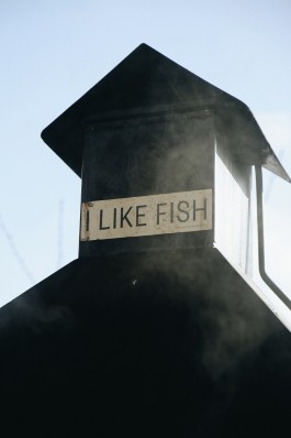 Das Räuchern ist zeitintensiv, eineinhalb bis zwei Stunden lang steht Micha neben seinen Öfen. Länger als fünf Minuten lässt er sie nie allein. »Ich mach nochmal auf. Was man jetzt schon schön riechen kann, ist das Wacholderholz, diese Süße.« Und wie — aus dem Inneren des Ofens duftet es herrlich. Die Fische bekommen langsam eine goldene Farbe. Nach gefühlt hundertmaligem Öffnen und Schließen der Öfen, nachdem auch noch Buchenspäne zugegeben wurden und immer wieder mit der Hand die Temperatur am Dach gemessen wurde, sind die Fische irgendwann fertig und werden zum Abkühlen zwischen zwei Tischlerböcke gehängt.