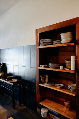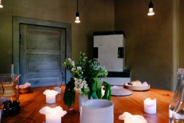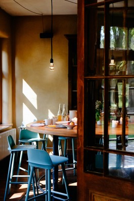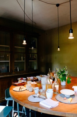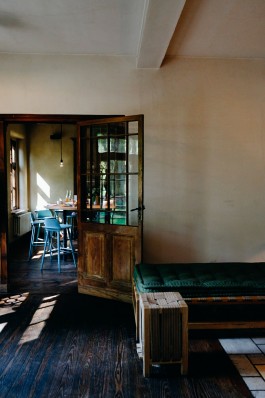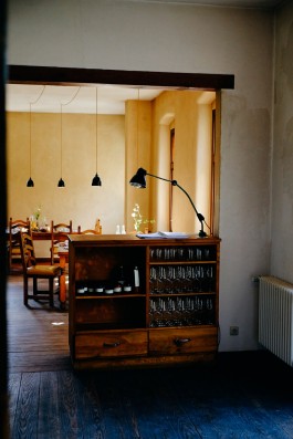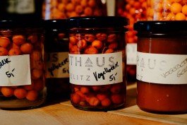 Allein der große runde Tisch, an dem wir gemeinsam mit anderen Gästen speisen, ist eine Garantie für einen unterhaltsamen Abend: Früher oder später kommt man mit jedem ins Gespräch — bei unserem Besuch sitzt neben uns der Schauspieler Jürgen Vogel. Da für alle die gleiche Menüfolge serviert wird kann man bei den Nachbarn, die schneller essen, schon mal schauen, was man gleich auf dem eigenen Teller haben wird. Hausherr Wenzel Pankratz bekocht uns mit wirklich spannenden sechs Gängen. Besonders die Kombinationen der Zutaten haben es uns angetan — Zander mit Lakritz und Zwiebel ist beispielsweise der Knaller. Seine Küche zieht auch Gäste von weiter her an, Berliner und auch Hamburger machen sich auf den Weg nach Neustrelitz. Für die Gäste, die gleich ein ganzes Wochenende hier draußen in der Idylle verbringen wollen, stehen acht schlicht und stilsicher eingerichtete Zimmer bereit. Mit den Produkten aus dem Hofladen kann man sich dann auch den Geschmack des Abends als Erinnerung mit nach Hause nehmen. Die Regale sind bestückt mit allerhand Eingelegtem, mit selbstgemachten Marmeladen, Honig und Säften.