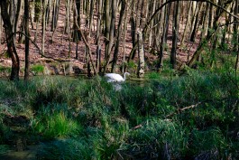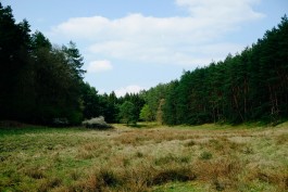 Kurz hinter der Voßwinkler Schleuse erreichen wir die Kalkhorst, ein teilweise als Naturschutzgebiet ausgewiesenes Waldstück, dessen Name auf den kalkhaltigen Boden verweist. Wir passieren moorige Flächen und einen alten Laubwaldbestand. Die Schilder des Naturlehrpfades erklären uns die Pflanzen und Tiere, die wir sehen. Wir wundern uns über tief ausgehobene Löcher am Wegrand — es sind ehemalige Wolfsgruben. Daneben ragen riesige Nadelbäume in den Himmel, die wir nun als Douglasien benennen können. Aber bei der Orientierung helfen uns diese Lehrschilder nicht weiter, wir verfranzen uns ganz ordentlich im dichten Wegenetz und brauchen eine ganze Weile bis wir wieder auf den richtigen Weg zurückfinden. Eine Lindenallee führt uns schließlich wieder aus dem Wald hinaus. Über Felder geht es noch ein Stück gen Süden bevor wir an der Bundesstraße mit dem Forsthaus Strelitz unser Etappenziel erreichen.