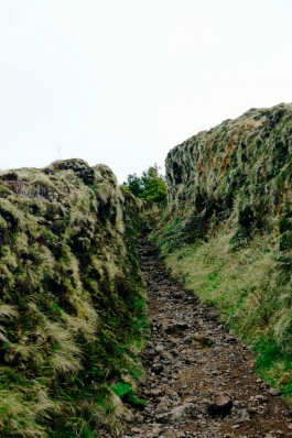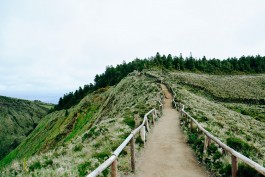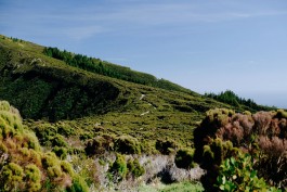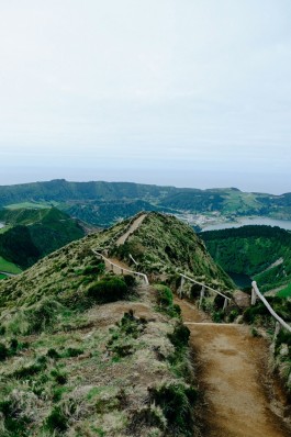 Die Tageswanderung am zweiten Tag — Caldeira das Sete Cidades — einmal rundherum auf dem Kesselrand bietet spektakuläre Blicke und ist ein Klassiker unter den Inseltouren. Das Motiv der zwei Kraterseen Lagoa Azul und Lagoa Verde schmückt Postkarten wie Reiseführer — zurecht. Himmel, Wasser, grüne Wiesen. Es ist atemberaubend. Auch das Meer ist vom Grat aus immer in Sichtweite. Größtenteils breite Schotterwege, die manchmal auch von Autos genutzt werden, führen auf dem Kraterrand einmal rundherum um die Vulkanseen. Ein kurzer Abstieg in Richtung des Ortes Sete Cidades (»sieben Städte«) bringt die Möglichkeit mit sich, im Notfall abzukürzen. Skurril ist ein Abstecher in die Hotelruine Monte Palace, die auf dem Weg liegt. Hier wurde in den 1980er Jahren ein gerade erst eröffnetes Nobelhotel aufgegeben und zeigt sich heute als vergessener Ort und geisterhafte Fotokulisse. Die Aussicht am Miradouro da Vista do Rei begeistert eine Vielzahl von Ausflüglern, doch auch überall sonst ist der Blick nicht weniger spektakulär und man ist eher für sich.